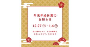 拝啓 平素は格別なるご高配を賜り、厚く御礼申し上げます。 さて、弊社の年末年始休業及び受注・配送業務を以下の通りお知らせいたします。 期間中は何かとご不便をおかけいたしますが、ご理解ご協力を頂きますよう何卒宜しくお願い申 […]